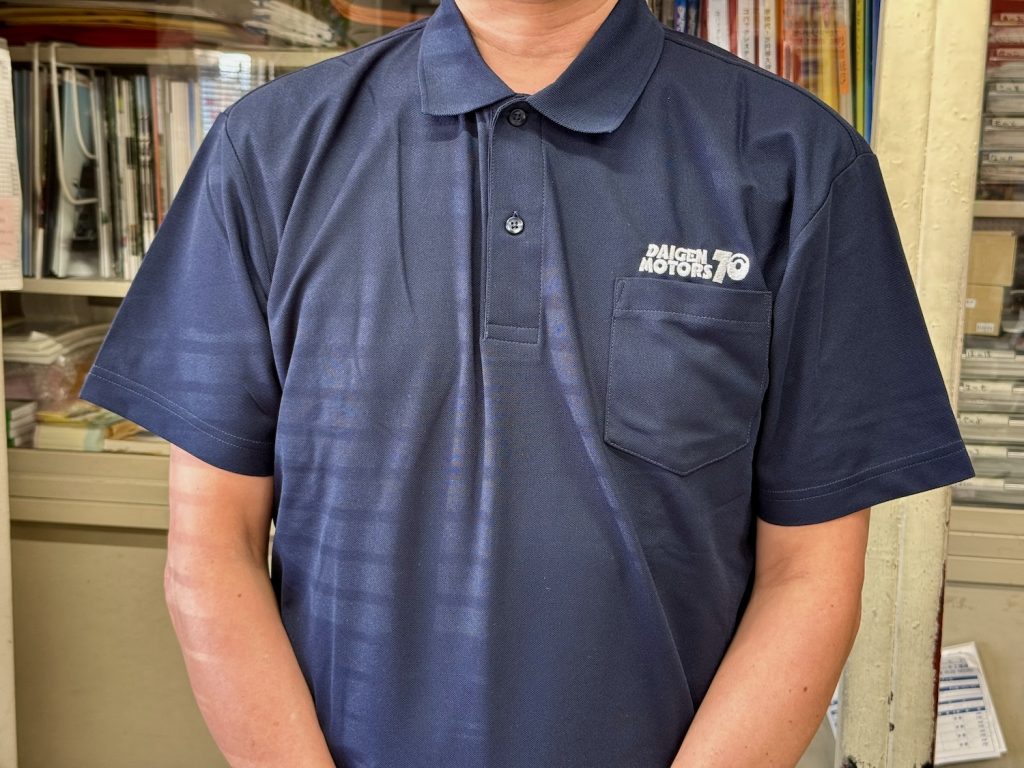 胸には刺繍で「DAIGEN MOTORS 70」というロゴが入っています。実は弊社、今年で創業70周年となります。特別何か催しをする予定もありませんでしたが、せっかくなので記念のデザインにしました。