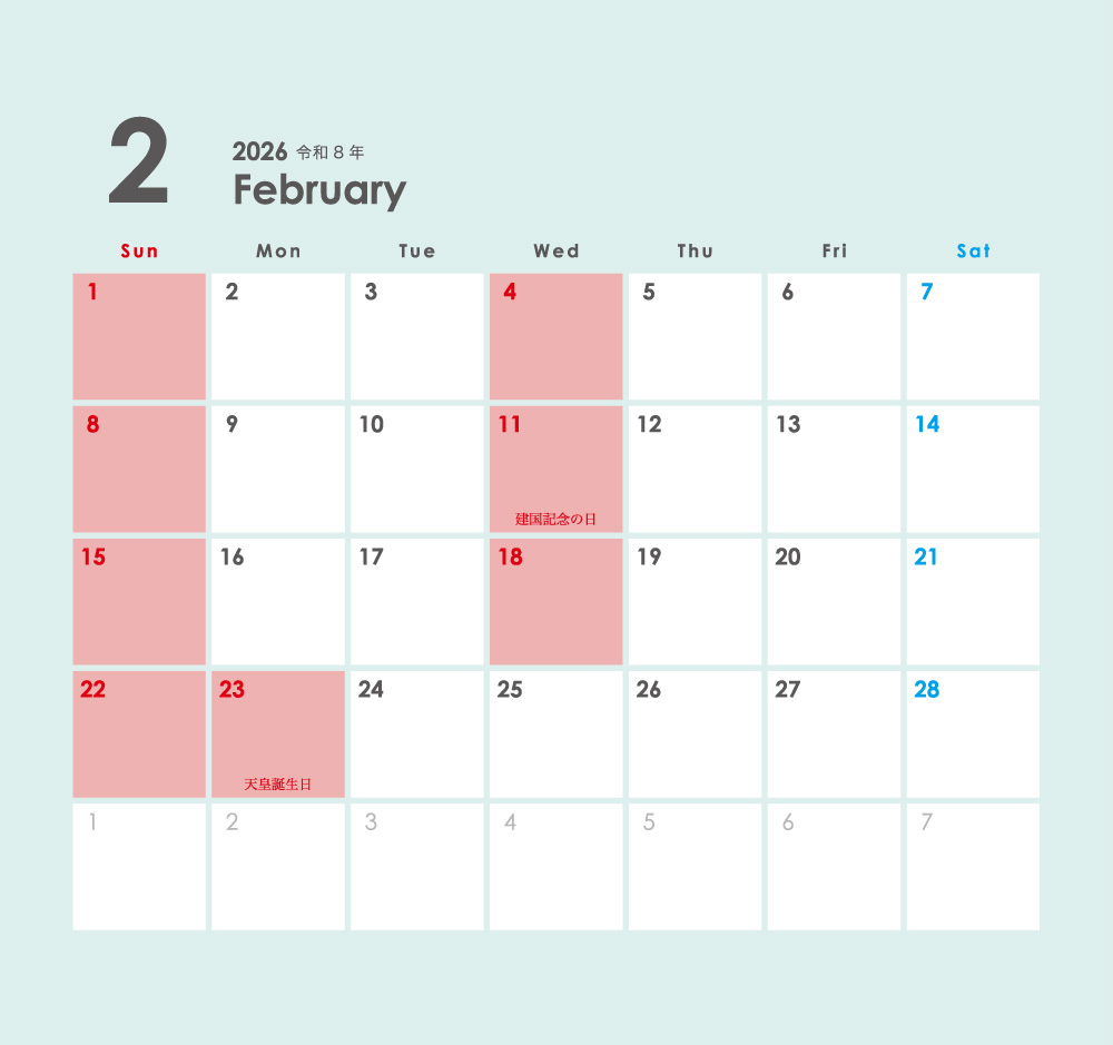 2月定休日についてご案内いたします。日曜日お休みに加えて、水曜日お休みが2回と、祝日の2日間お休みがあります。